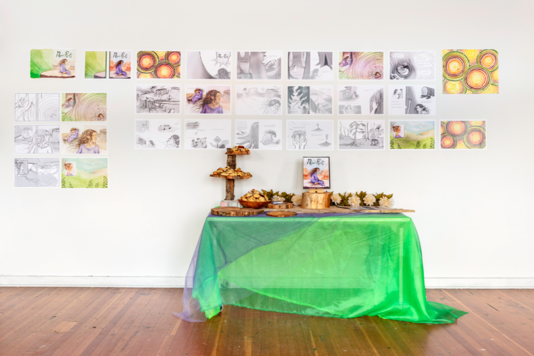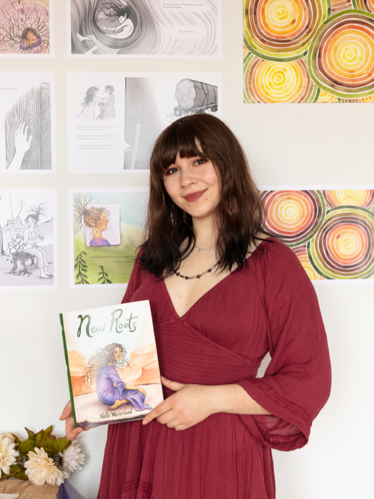 My thesis project, New Roots, is a 40-page picture book dummy that navigates themes of deforestation and environmental grief told through the eyes of a tree nymph exploring the modern world.